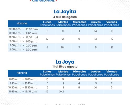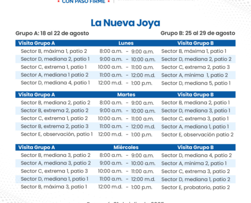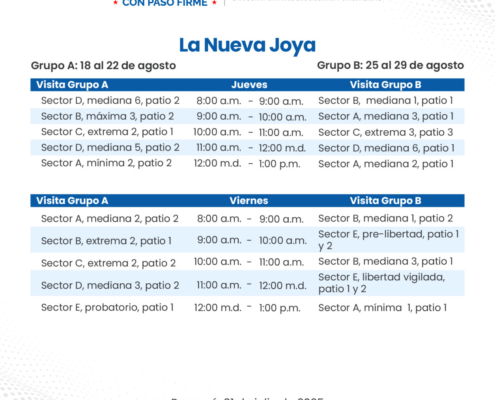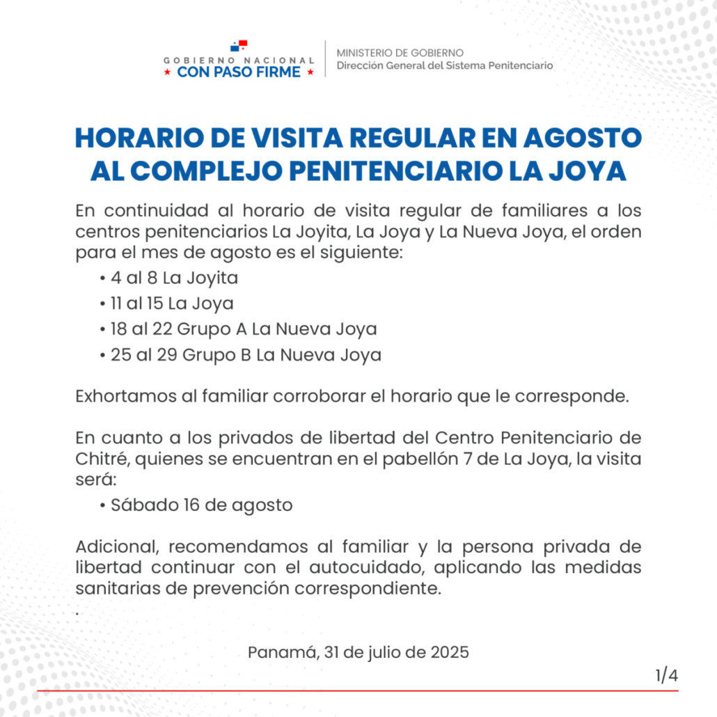 En continuidad al horario de visita regular de familiares a los centros penitenciarios La Joyita, La Joya y La Nueva Joya, el orden para el mes de agosto es el siguiente: