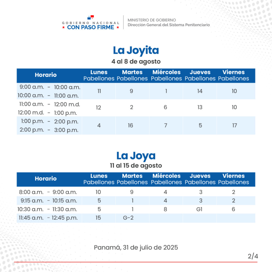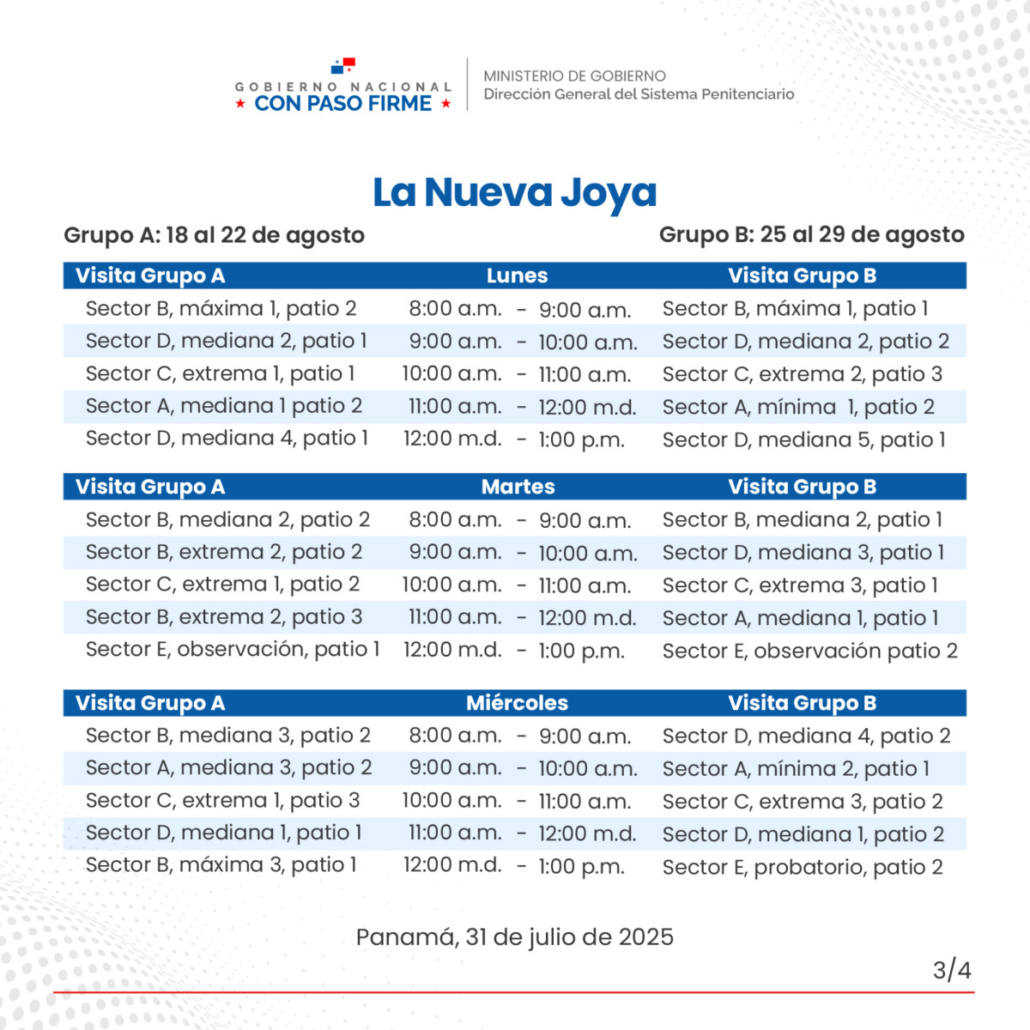En cuanto a los privados de libertad del Centro Penitenciario de Chitré, quienes se encuentran en el pabellón 7 de La Joya, la visita será: