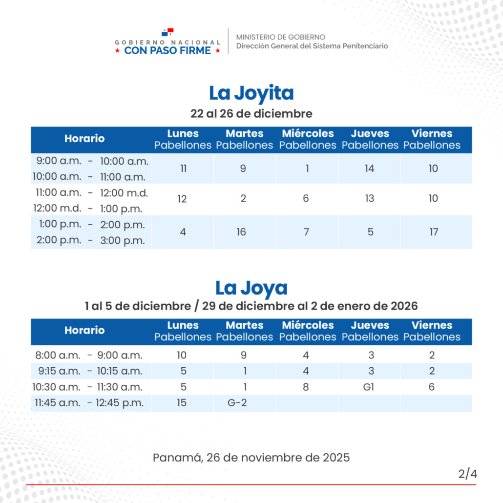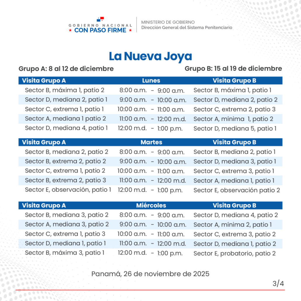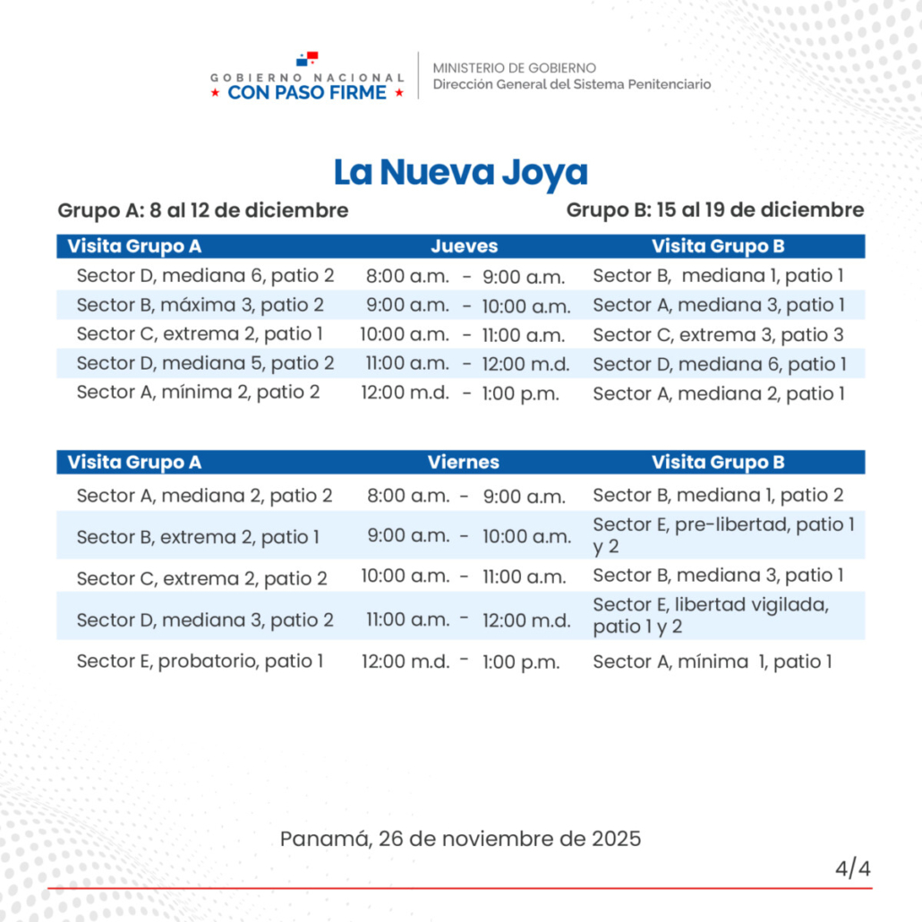 En cuanto a los privados de libertad del Centro Penitenciario de Chitré, quienes se encuentran en el pabellón 7 de La Joya, la visita será: