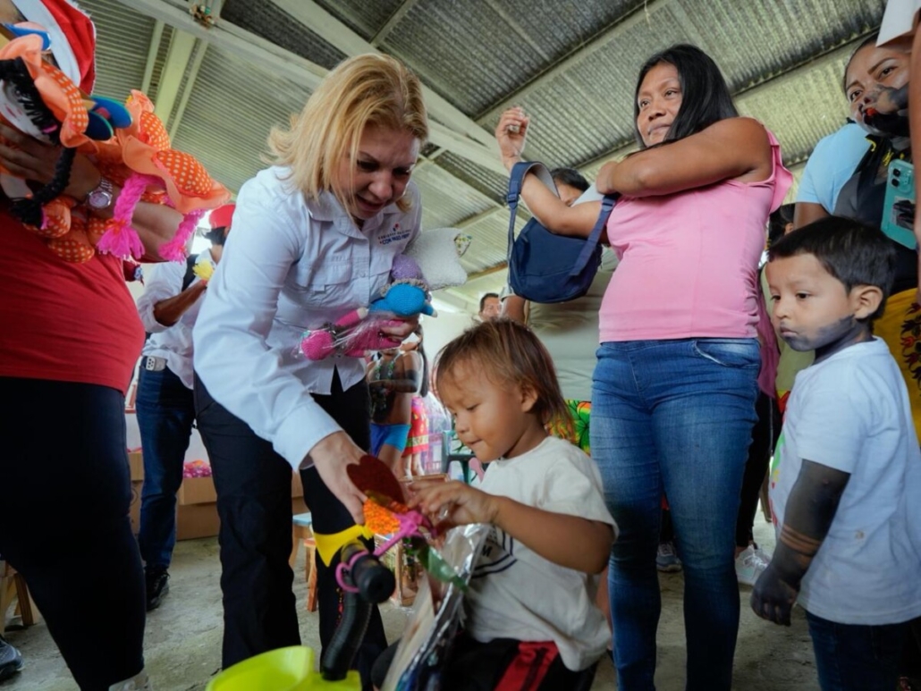 Piriatí Emberá, 17 de diciembre de 2025.- La entrega más linda, llegó a la comunidad de Piriatí Emberá, de manos de la ministra de Gobierno, Dinoska Montalvo y la Primera Dama, Maricel Cohen de Mulino, con muchos regalos y juguetes confeccionados por las personas privadas de libertad de los centros penitenciarios del país.